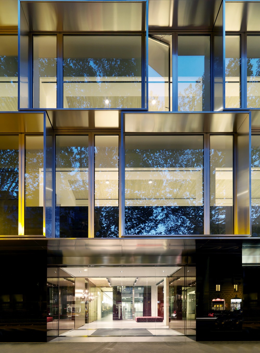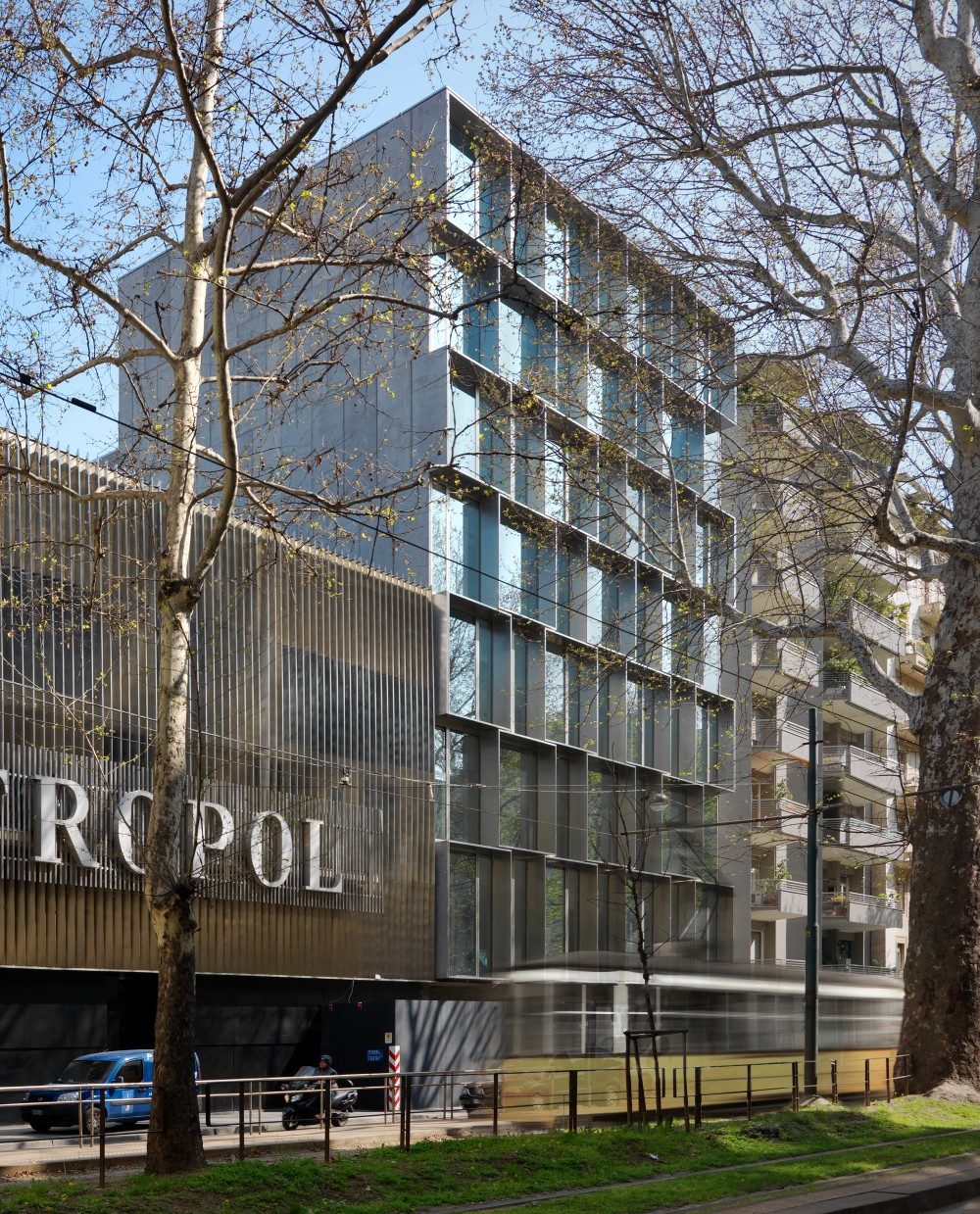 La fachada en Viale Piave cuenta con un sistema de brise-soleil de módulos cuadrados de 3.60×3.60m, superpuestos en forma escalonada, fabricados en acero inoxidable como los listones en la fachada del espacio adyacente Metropol. En la noche los anima la iluminación interior de la fachada y pone de manifiesto el patrón cromático de las ventanas, de cristal transparente en el que se alterna en tonos grises, correspondientes a las ventanas abiertas y aquellas que son fijas. Los siete pisos con ventanas están de pie sobre un zócalo que es similar en el tamaño y materialidad al Metropol, estableciendo una fuerte continuidad visual.