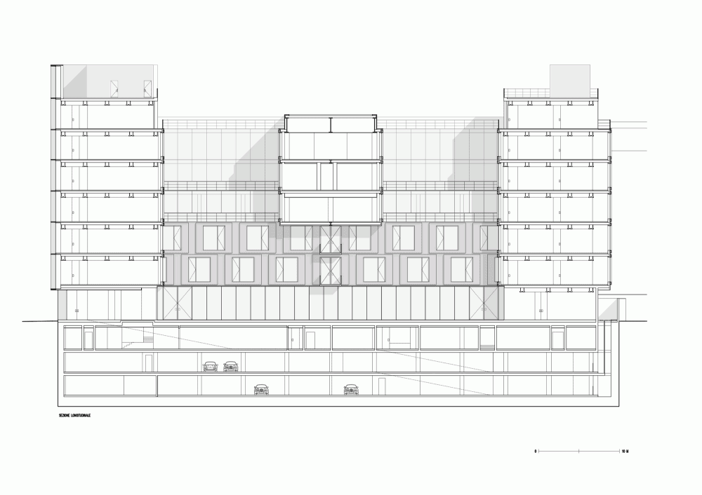 La forma larga y estrecha del lote y el volumen del edificio preexistente, han dado lugar a una solución de composición que incluye tres edificios paralelos. Un edificio de Viale Piave y otro de más atrás, que sube siete pisos sobre el suelo. El cuerpo central, unido al resto de la construcción mediante un sistema de escalera y vías aéreas, tiene tres pisos y es suspendido sobre un cuerpo que une los tres edificios, perpendicular a Viale Piave y con un aumento de cuatro pisos por encima del suelo. De esta manera se crea un gran patio interior, en el fondo, pasado por el alto de los edificios. El plan también asegura tres pisos subterráneos, dos para ser usados como estacionamiento.