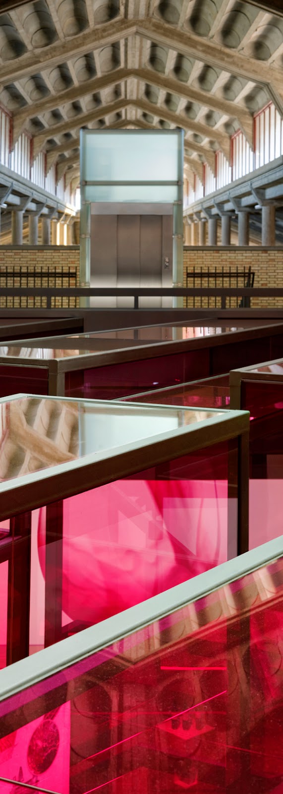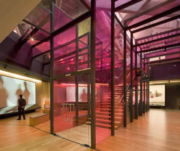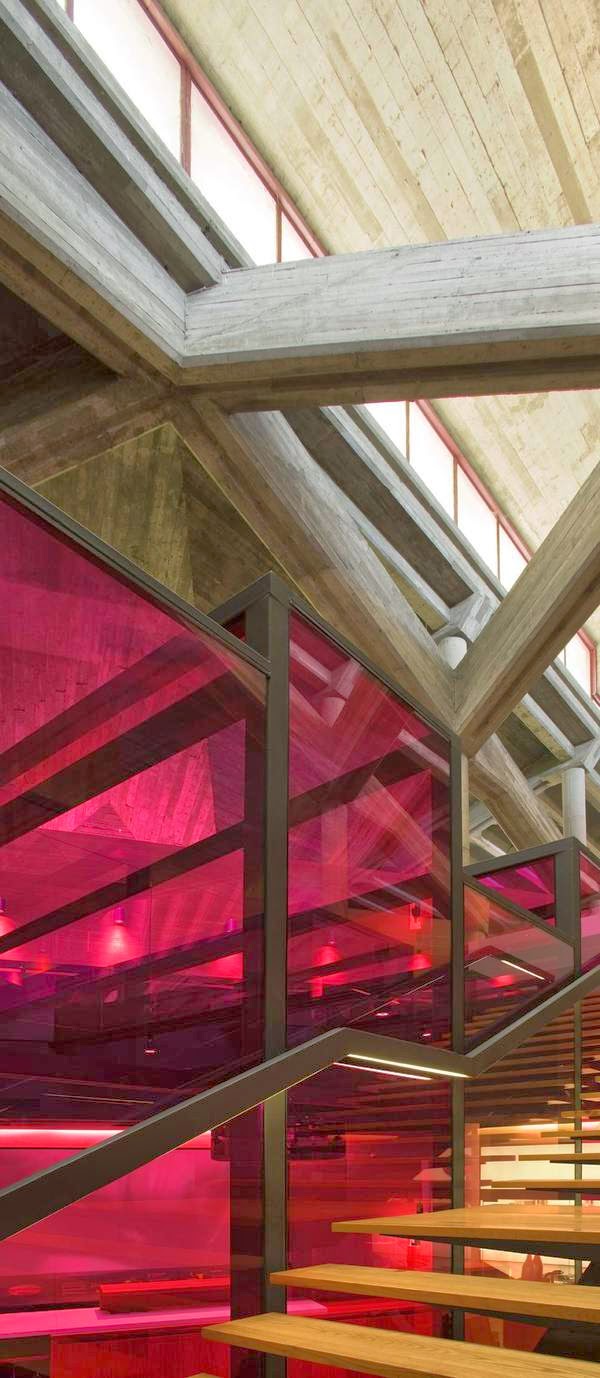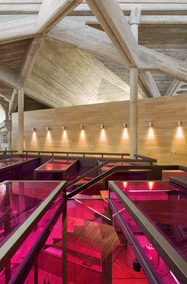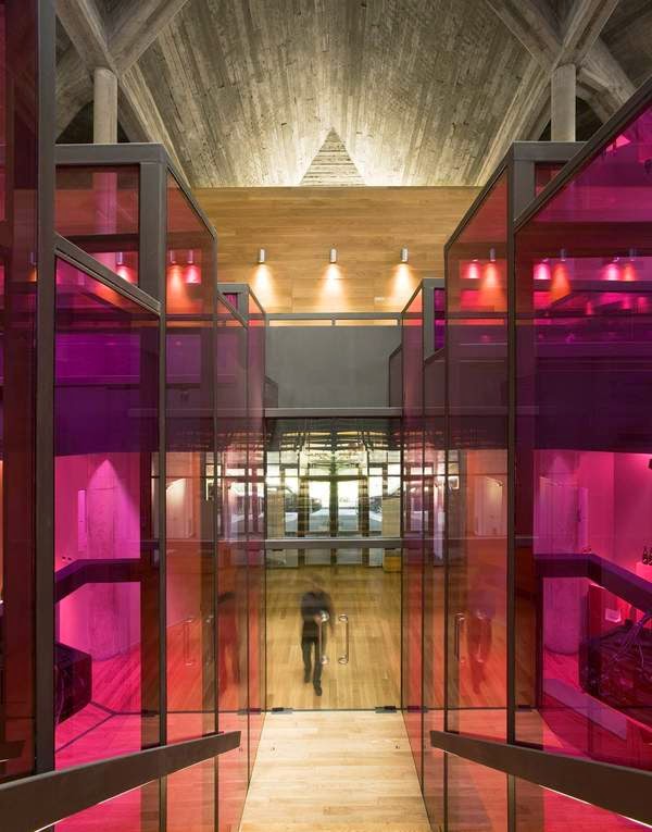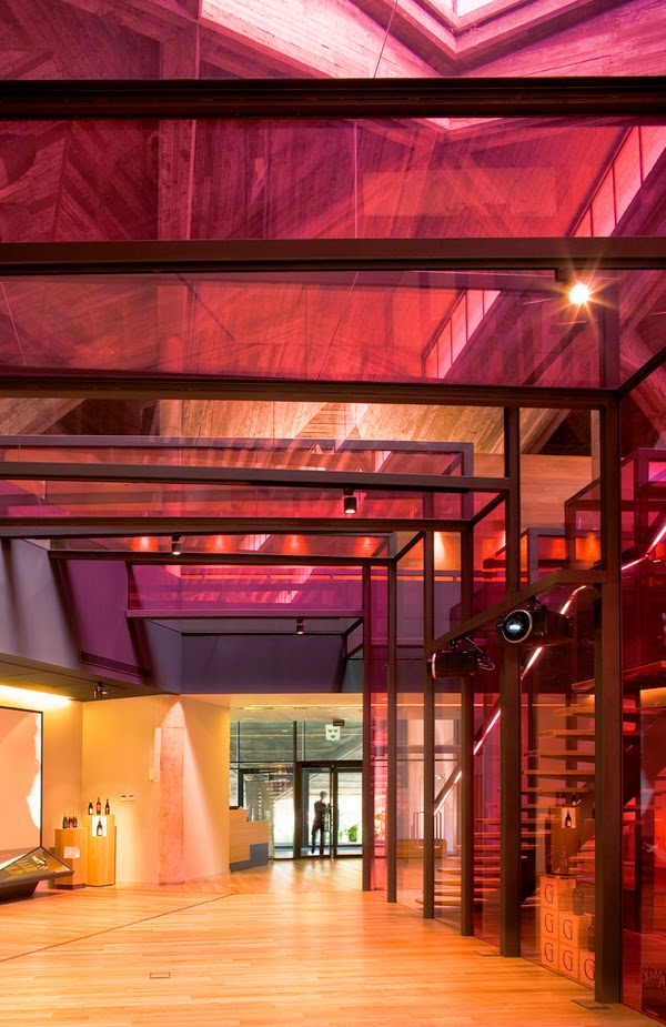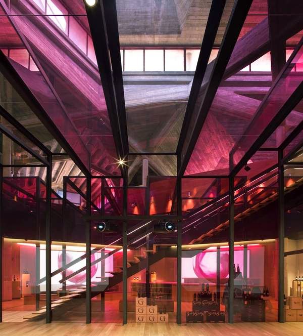 The spaces designed for the lower level reflect the strong geometry of the space adjusting itself to it under a large glass enclosure which uses different glass colors as a metaphor for wine types.