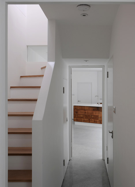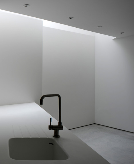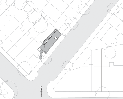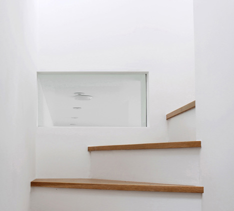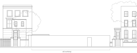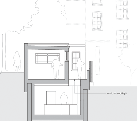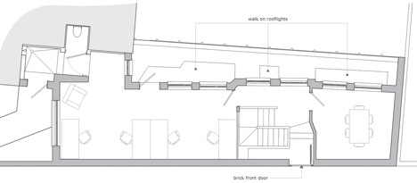 An office and meeting room occupy the ground floor level, while the basement contains a residence that is naturally lit through a row of walk-on skylights.