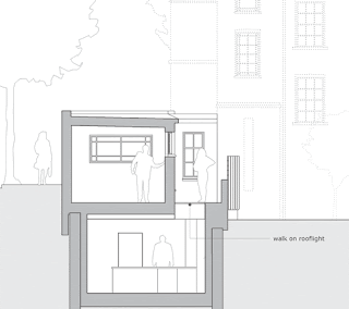 To increase the habitable volume, a new basement level with generous ceiling heights was inserted under the original, but offset horizontally to allow daylight to penetrate through walk on roof lights running along its length.