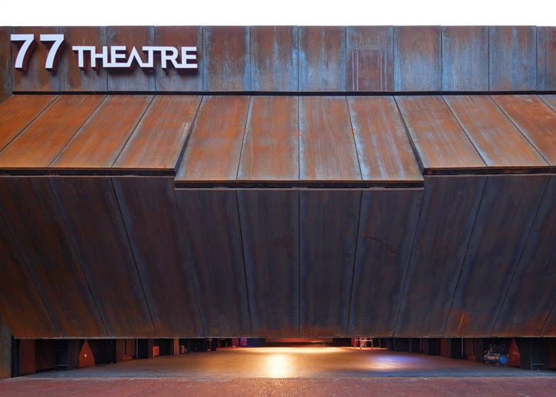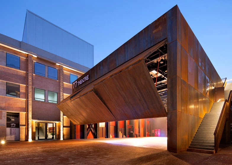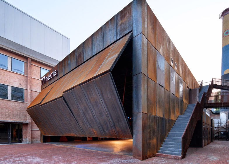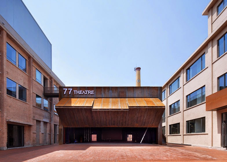 A huge folding wall lifts up to reveal the contents of a weathered steel auditorium at this abandoned printing factory in Beijing, which Chinese studio Origin Architect has converted into a theatre complex