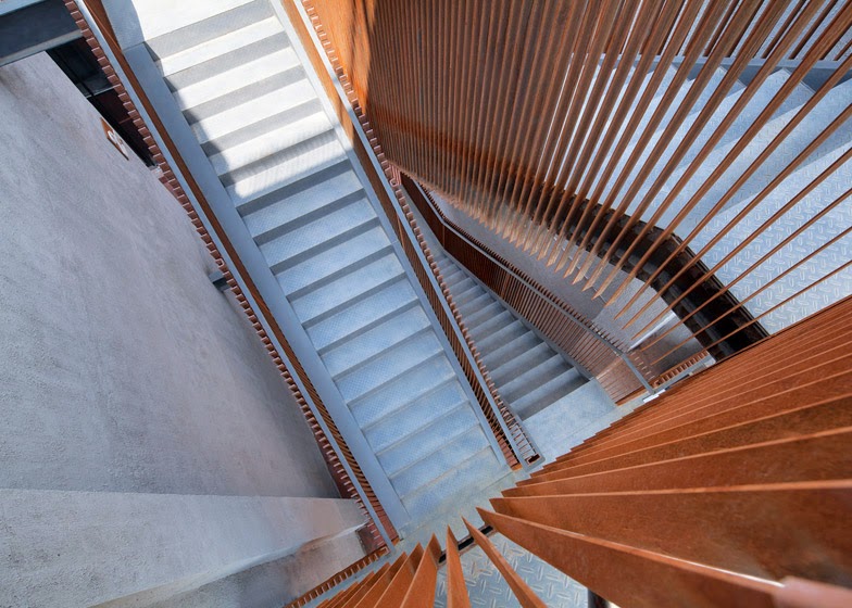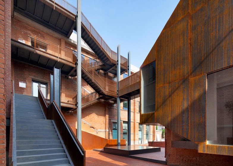 The architect began the renovation by removing a series of existing smaller buildings and extensions, freeing up space to create courtyards in the centre of the site. In the middle of these, a large warehouse with Corten steel walls provides the new theatre block.