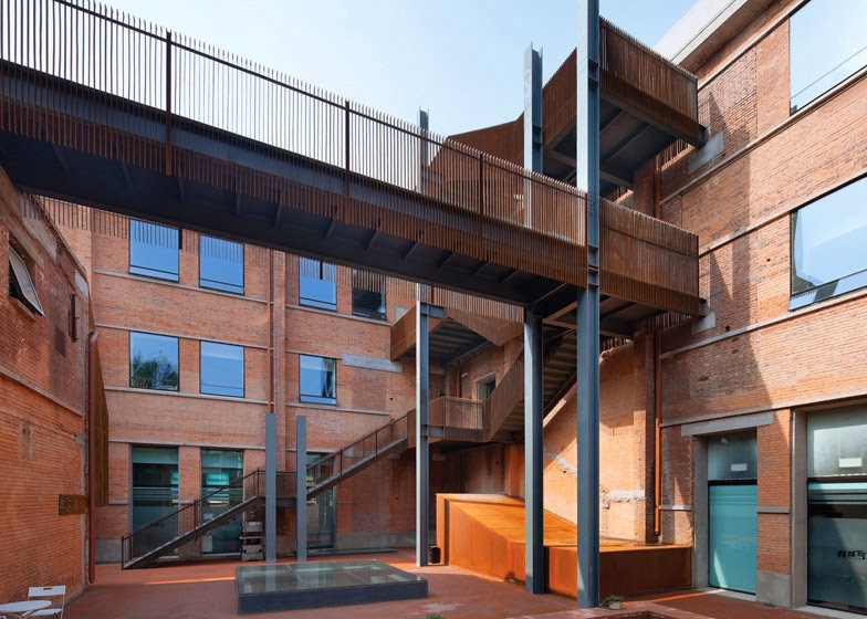 The architect also removed layers of paint and plaster – accumulated over many years – from the facades of the old factories, exposing the original brickwork. The interiors were gutted, creating spaces that can be used as galleries or studios for artists.