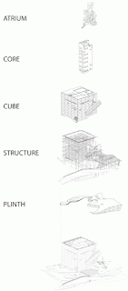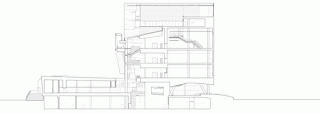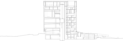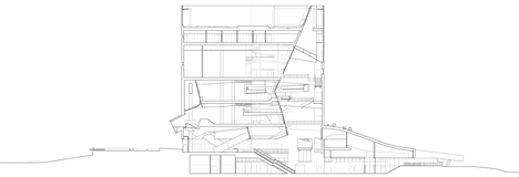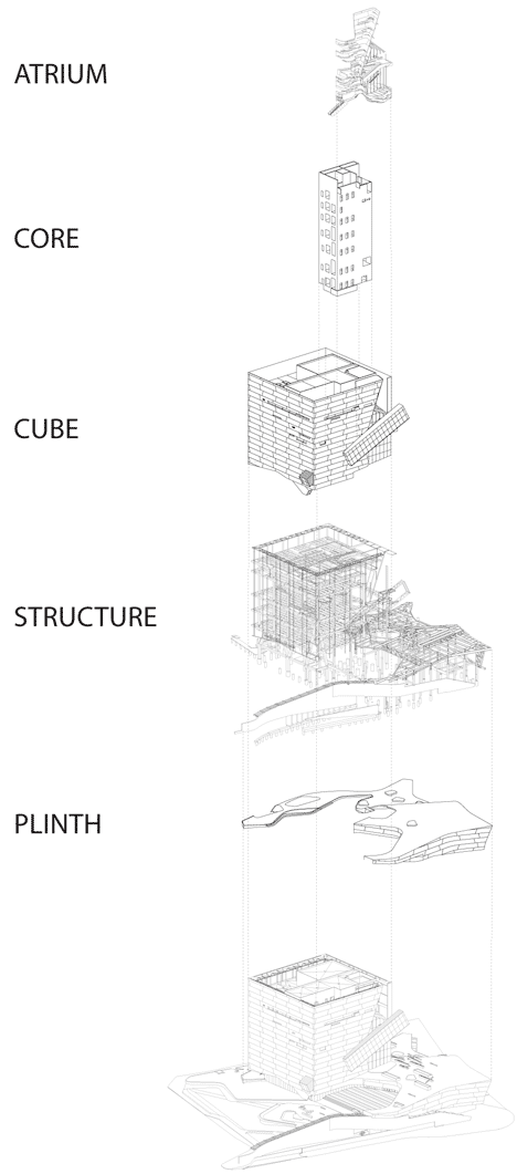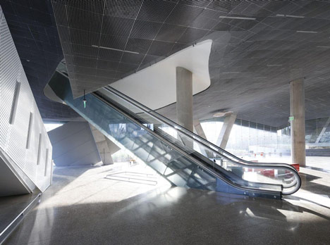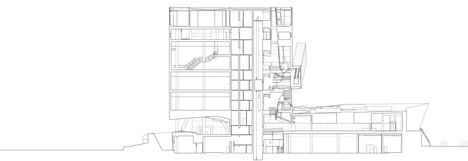 Surrounded by glazing, the escalator streaks diagonally across the striated concrete facade then angles back inside the building. At the top, each visitor is faced with a view of the city before spiralling their way back down through five exhibition floors into the atrium where they first arrived.