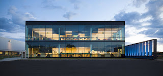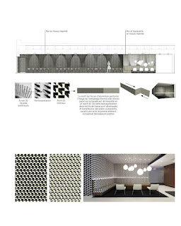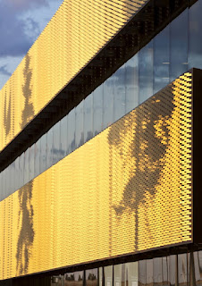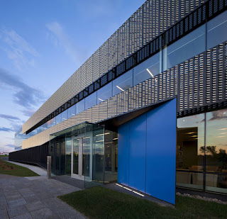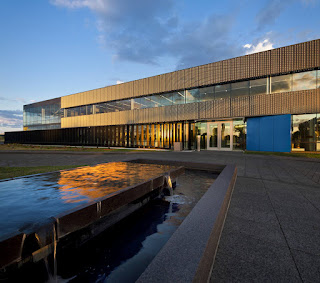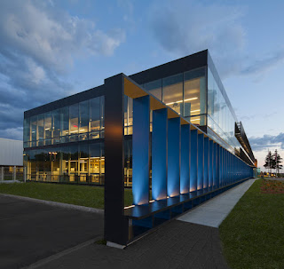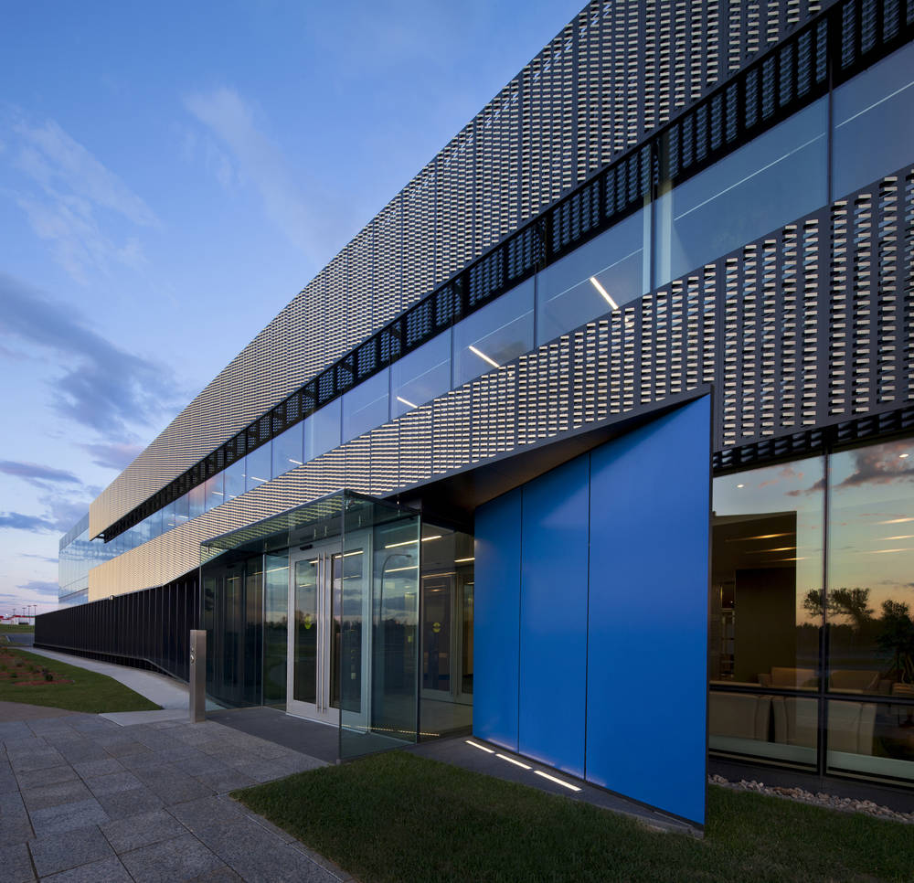 The alveolate structure has been transposed to create an elegant motif displaying a variety of textures that responds to the changing light. The screen openings of the facade reproduce both the scale and the texture of the local brick, which are enriched through a wide range of colors ranging from silver to gold. The blue of the Pfizer logo is also very visible and create a recurring theme; it occurs both on the external facade and in the core of the building. A bond is created between the industrial park, the highway, the company and the building space. Vivid and contemporary, the facades give expression to the unity of the whole. Inside, the redefinition of the site offers brand new, healthy and inspiring workspaces leading the way to a greater economic impact while attracting utmost qualified employees.