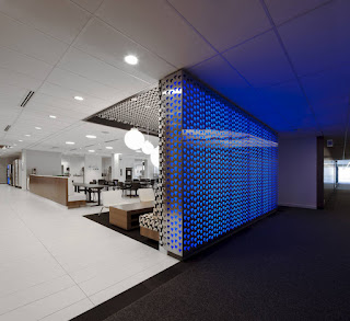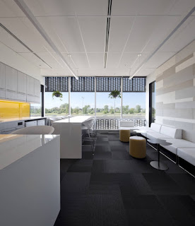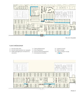 Physical departmental barriers have been removed in order to promote the social values of the company. Access points offer the possibility of modifying group working areas, particularly in terms of workloads. Flexible and open work areas have been developed as well as private areas, glassed conference areas with a view over the gardens and the work rooms located on the periphery of the working areas. The result of this organization is a fluid ring of traffic. The full redefinition of work functions and qualities for employee work stations ensures that employees will discover new ways to live and work.