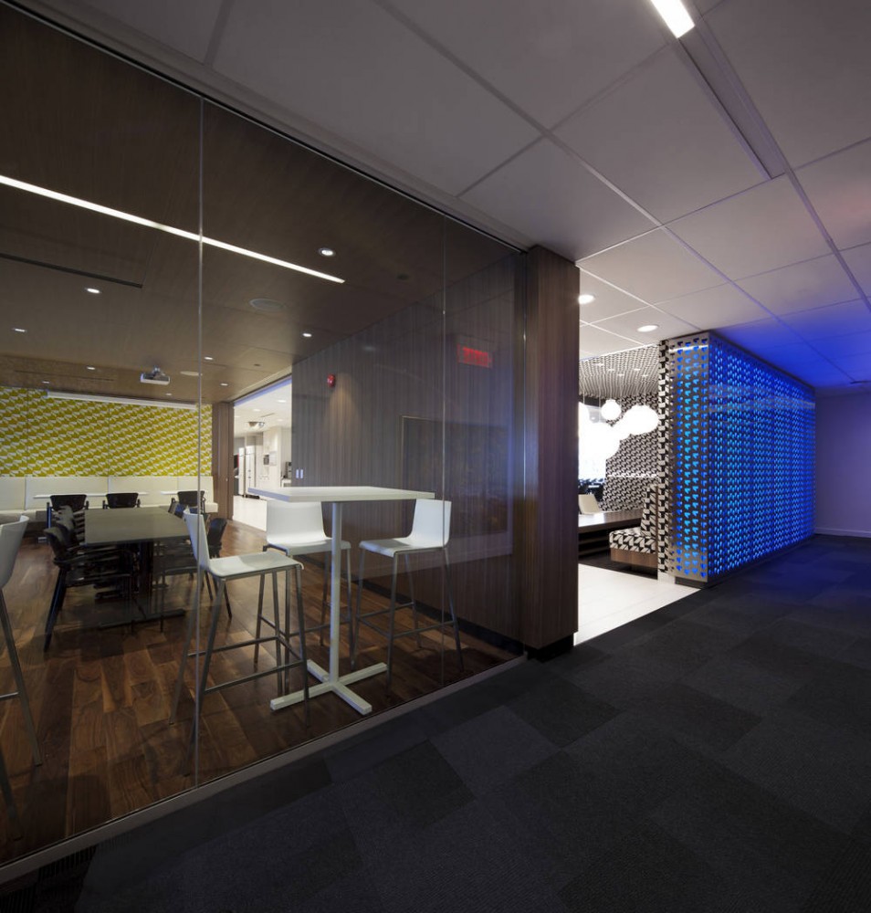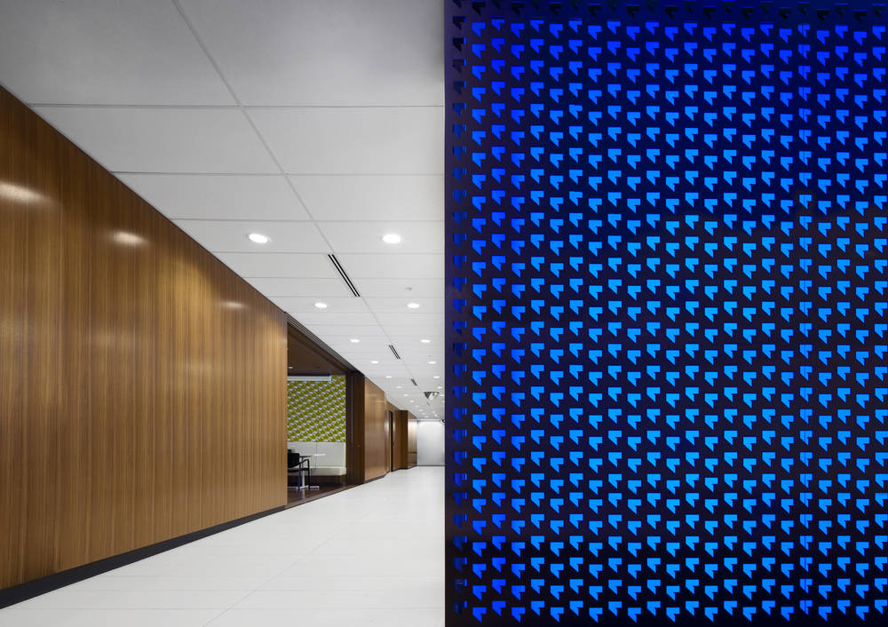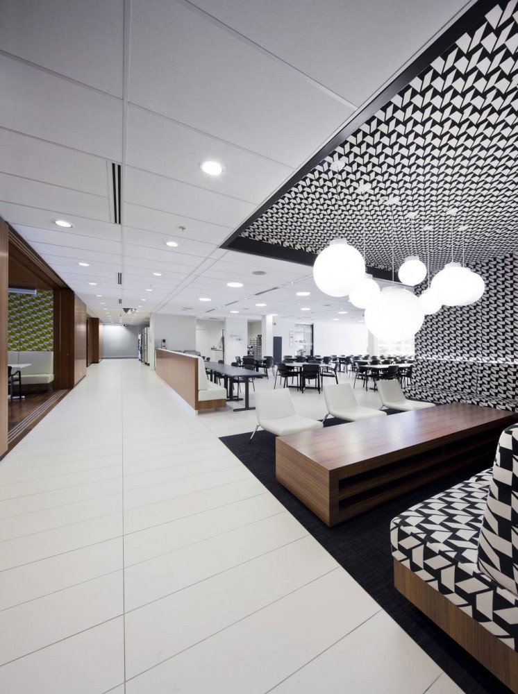 Change in culture. The occupancy ratio between common areas and closed offices went from 44/56 to 85/15. Eight hundred and sixty individual work stations have been streamlined and opened up through innovative design to increase productivity and the comfort of users. They focus on intercommunication between employees and an enhanced approach to cooperation. The interconnections are tangible: work, relaxation and service areas have been designed to innovate and optimize the sharing of ideas. All work stations are enclosed by lateral and transversal traffic corridors to ensure fluidity and ease of movement between groups.