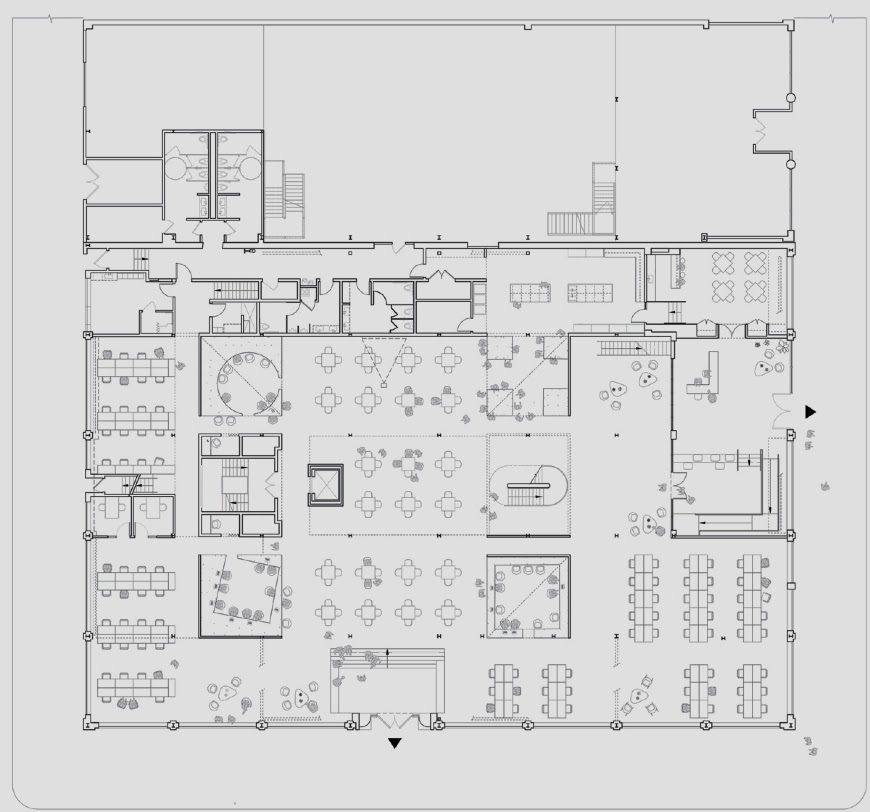 Circular and rectangular tables were purpose built for different types of meetings. Flexible desk arrangements and service areas fill the spaces surrounding the enclosed volumes.