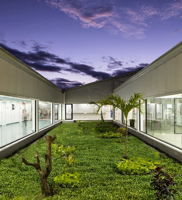the county of puyo in ecuador has received a new healthcare facility by Pm,Mt arquitectura (patricio martínez, maximiá torruella) the ‘hospital in puyo’ is composed of three rows of eight staggered volumes that are each shaped with the silhouette of a house. the long pavilions are arranged next to one another, and at certain points are physically connected by pitched roof structures from the exterior, with linking hallways along the interior below. glazing runs along the inner and outer lengths of the walls, offering visitors, patients and staff of the hospital, views of lush green landscaping planted between openings throughout the site. the challenge posed when building the complex was that it needed to be constructed in record time–less than one year–while still emerging as a first-class leading facility for the area. to finish within the time frame Pm,Mt developed a modular architecture, with a high degree of fabrication as seen by the identical nature of the building components.