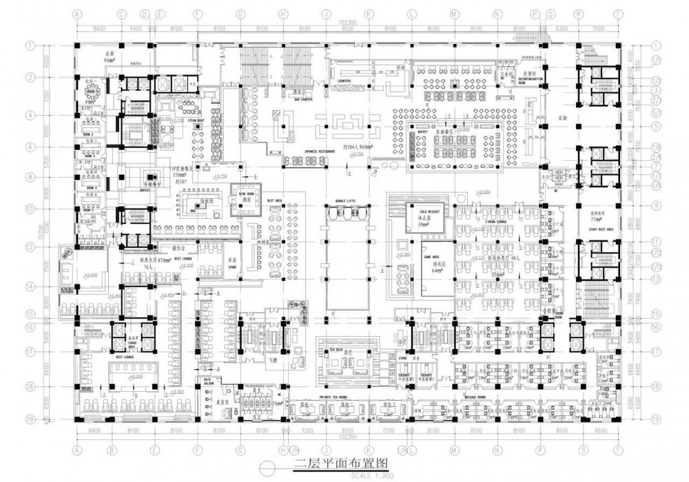El segundo piso aloja un restaurant japonés con 184 ubicaciones, un área de buffet, un resturant VIP, una zona de cine, zonas de descanso, áreas de degustación de té, salón de belleza, y salas de masaje.