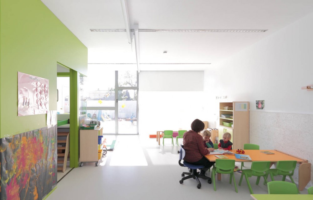 5 main areas are disposed (3 classrooms, multipurpose and administration space) on the Southern Façade with access to the courtyard and totally transparent so as to enhance luminosity. The “service facilities” (kitchen, changing room, and ware house) are located on the Northern Façade and are used as a “thermal mattress” against moisture and wind.