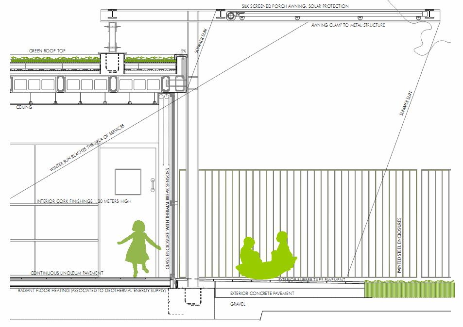 The building has got a green roof top; geothermal energy supply associated with a radiant floor heating; thermical insulation and interior finishings made of cork (proximity material); glass enclosures with thermal break sensors, along with an awning for nature light control, functioning as a large artificial tree.