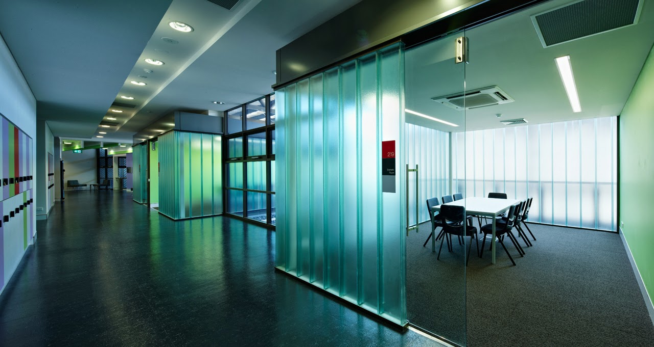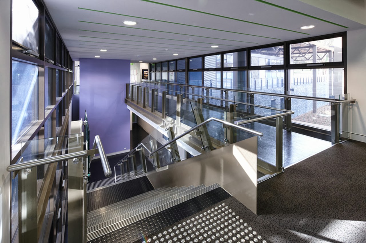 The building was designed to achieve 5 Greenstar (without certification). It incorporates passive/ active carbon reduction strategies: double skin ventilated roof, layered envelope with enhanced insulation, double glazing, and extensive sun shading. It has a mixed mode HVAC with fan induced thermal chimneys, BMS controlled purging and PV arrays. Daylight sensors in all spaces control light switching. Rainwater harvesting supplements the building’s extensive greywater recycling.