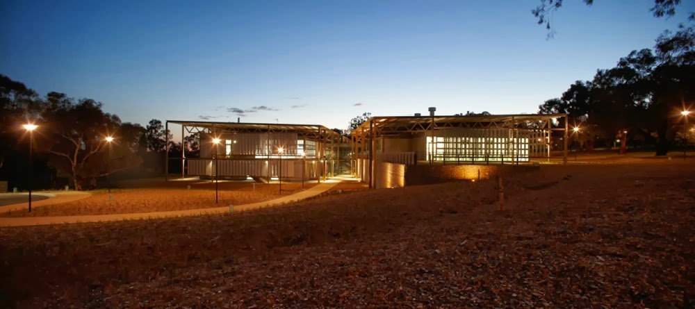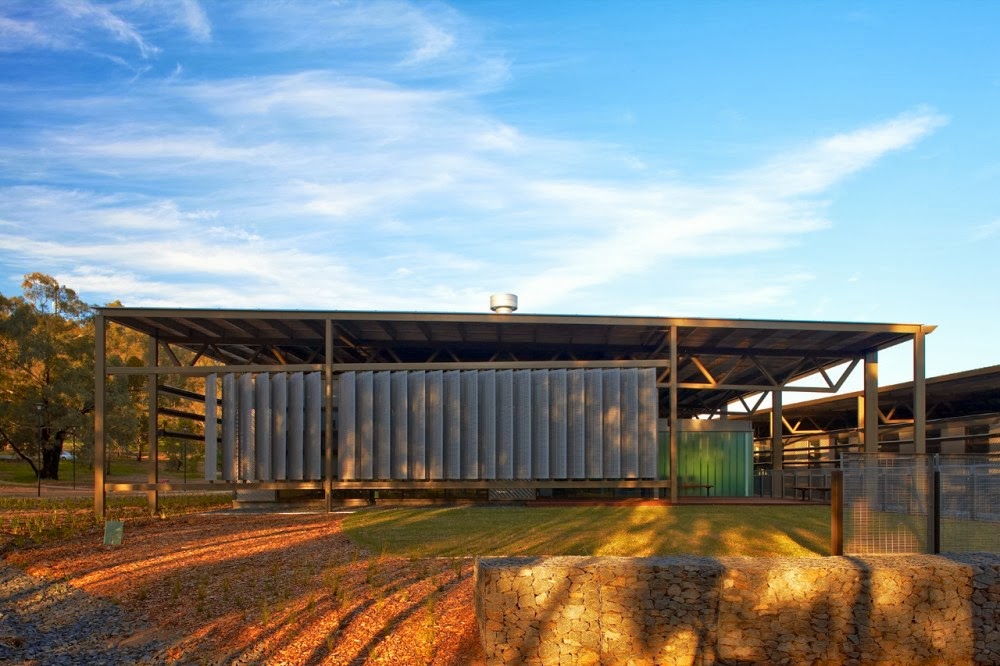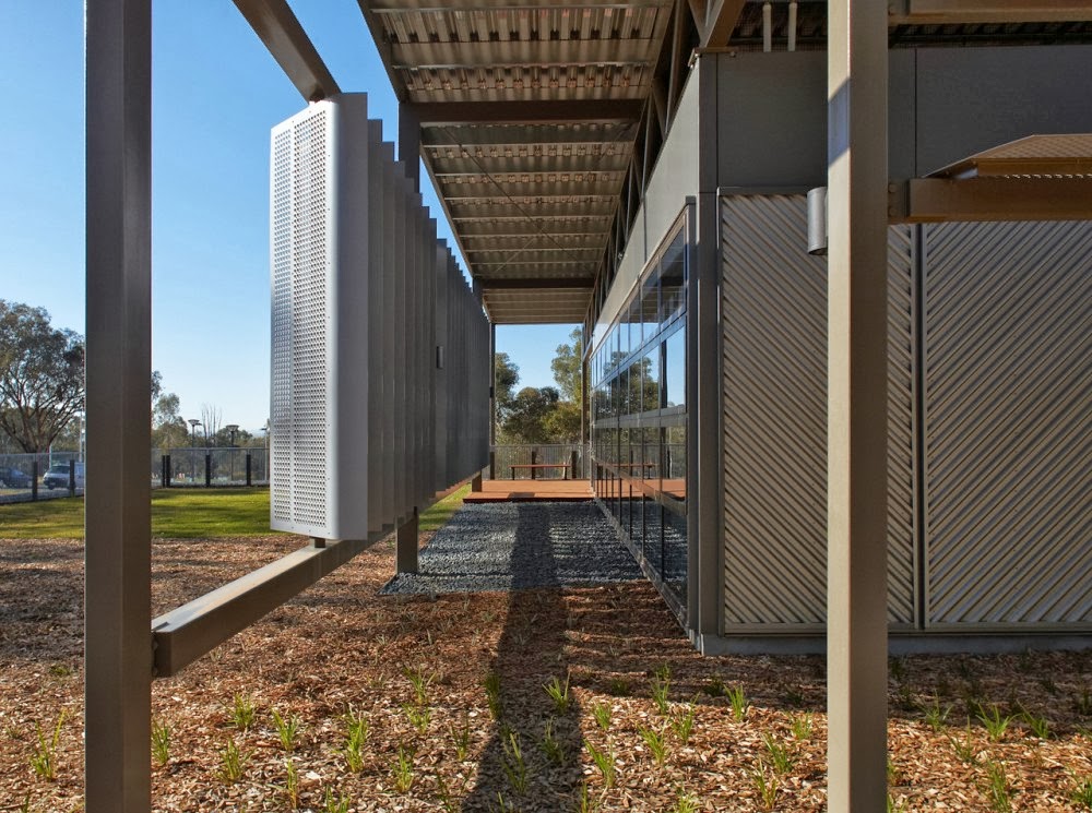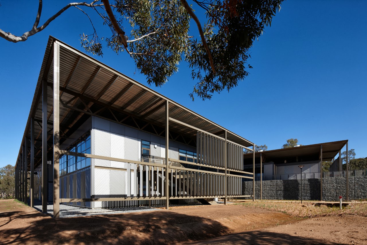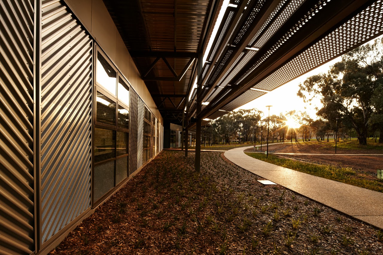 Two main wings are laid out along the natural contours of the site; each has a deep layering of structure, sunshading and facade that create a series of permeable veils. The dark colour and slenderness of the steel structure and the complexity and colour of the overlapping layers create an impression that the building is a natural part of the site, reminiscent of the stands of gums which surround it The building shares the site with the endangered Superb Parrot and takes their bright hues for its internal colour scheme.