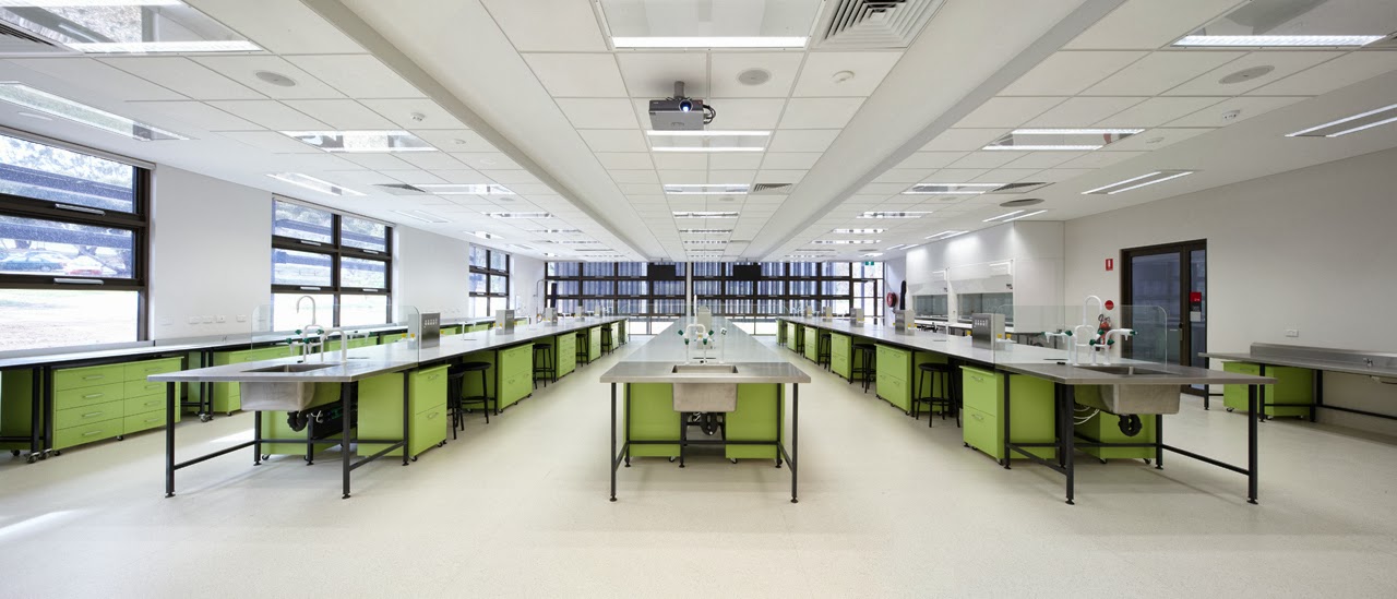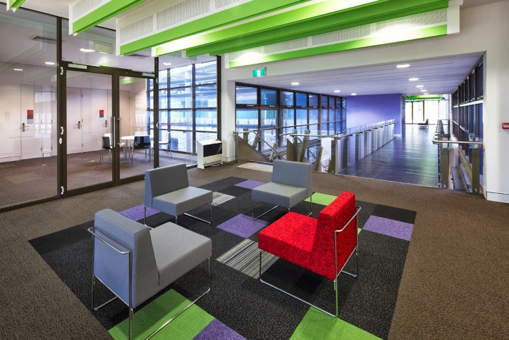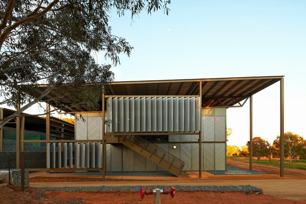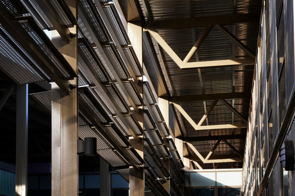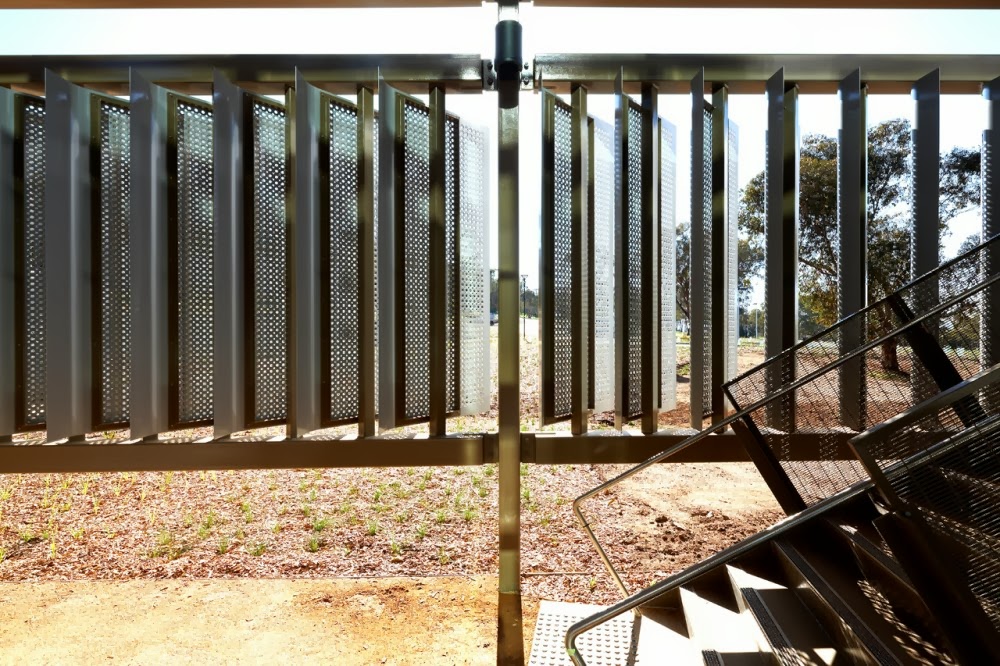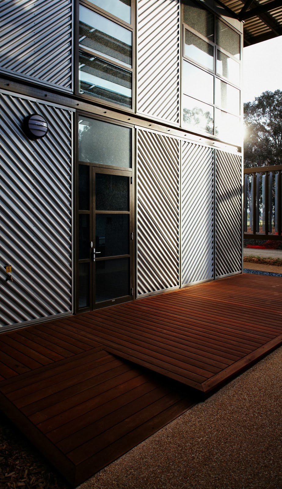 Two main wings are laid out along the natural contours of the site; each has a deep layering of structure, sunshading and facade that create a series of permeable veils. The dark colour and slenderness of the steel structure and the complexity and colour of the overlapping layers create an impression that the building is a natural part of the site, reminiscent of the stands of gums which surround it The building shares the site with the endangered Superb Parrot and takes their bright hues for its internal colour scheme.