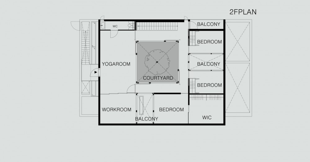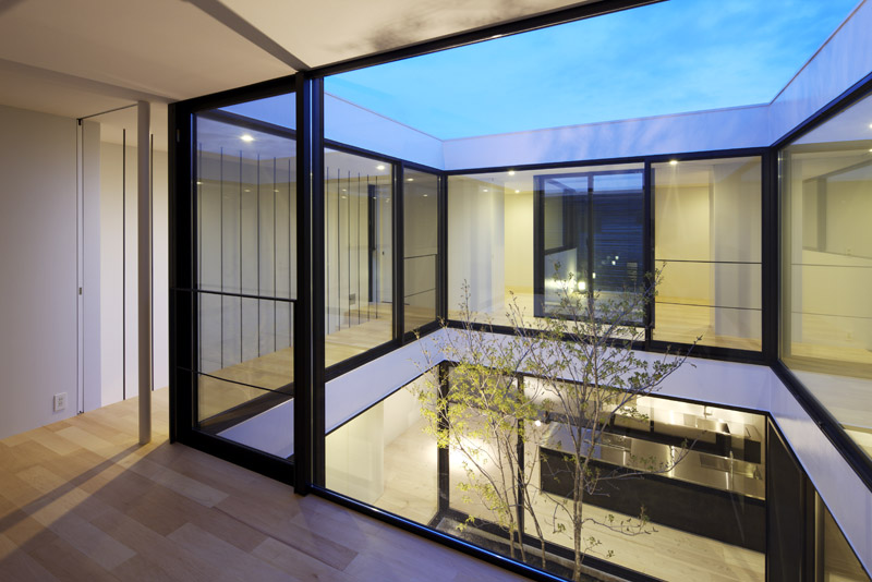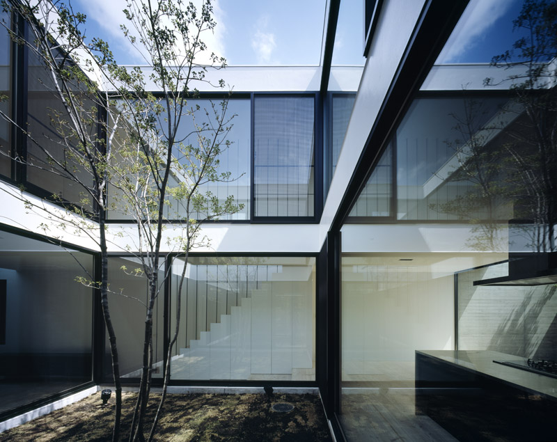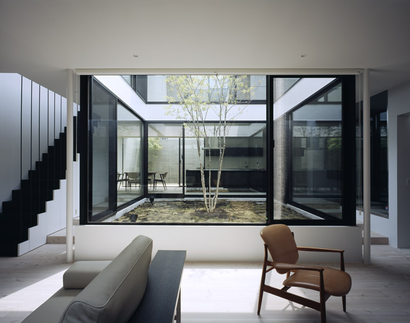 In sharp contrast to the exterior that is closed to the outside world, an inner courtyard pierces the center of the structure. With a hollow center, the house is easy walk around and allows for the presence of family members to be felt from anywhere. The symbolic tree in the courtyard plays a central role in sustaining the equilibrium of the architecture.