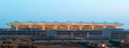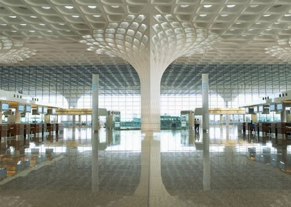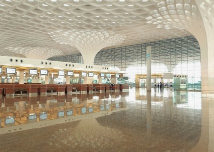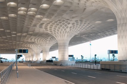 Recientemente inaugurada, la Terminal 2 del aeropuerto Chhatrapati Shivaji de Bombay, obra de la firma norteamericana SOM (Skidmore, Owings y Merrill), presenta una característica cubierta de hormigón esculpida con motivos inspirados en la tradición constructiva de pabellones y patios en la India. Soportado por treinta columnas, el conjunto de celdas incorpora piezas de vidrio cuyos colores semejan a los de la cola de un pavo real, ave emblema del país. La cubierta decorativa se extiende al exterior del edificio de cuatro plantas y fachadas acristaladas. Con 40 hectáreas, la terminal está organizada en una planta con forma de X —que incluye un diseño modular con el objetivo de reducir los plazos de construcción— para optimizar circulaciones en el tránsito de pasajeros con vuelos domésticos e internacionales.