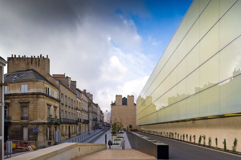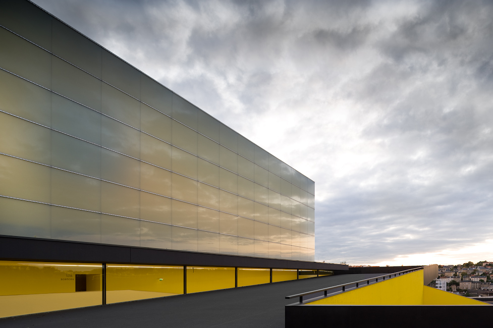 The limestone platform open to the public ensures a spatial continuity with the city and a material homogeneity with the surroundings. Slightly suspended above it lie the parallelepiped volumes of the building, covered with white matt glass. This double skin – concrete/glass – was the only “luxury” we indulged in, for it works as a medium and allows mutations in the building exterior – of color, light, image… on the inside, the possibility of communication.