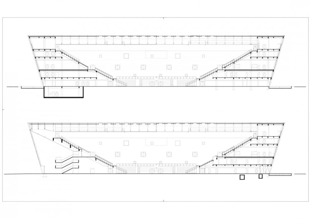Two spacious foyers open from the Sports Arena onto the campus. These two spaces cut through the outer skin of the building, and this break is further emphasized with large expanses of glass almost the entire height of the building some 24 meters. This created an entrance that is bright and flooded with light. Furthermore, the sloping roofs of the entrance halls create an entrance area that expands upwards.