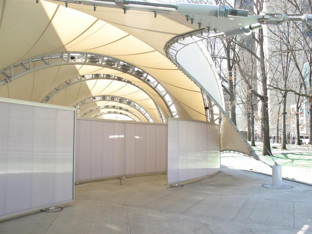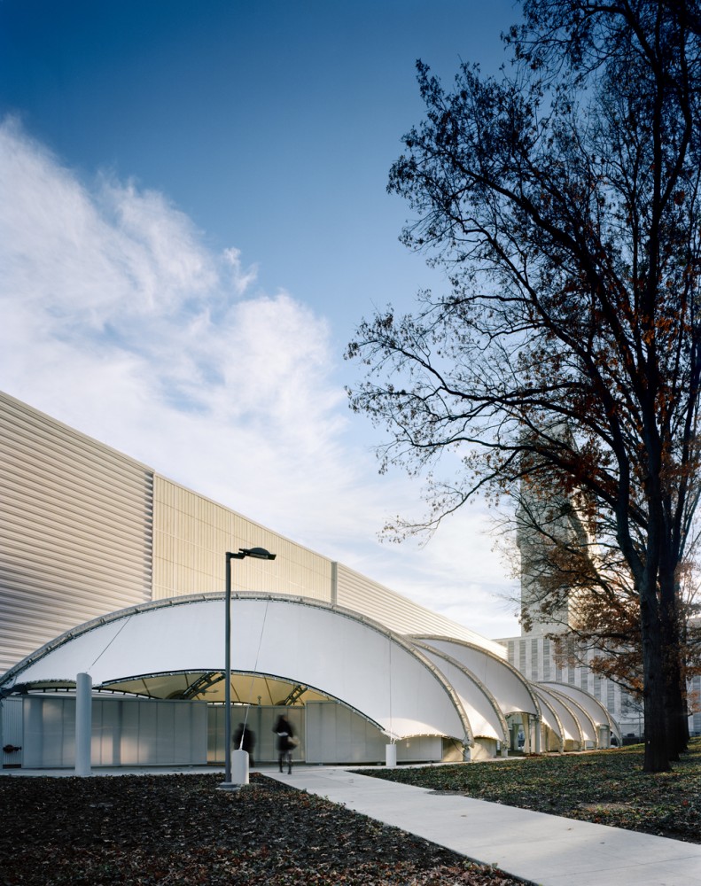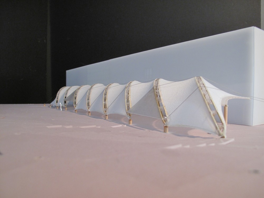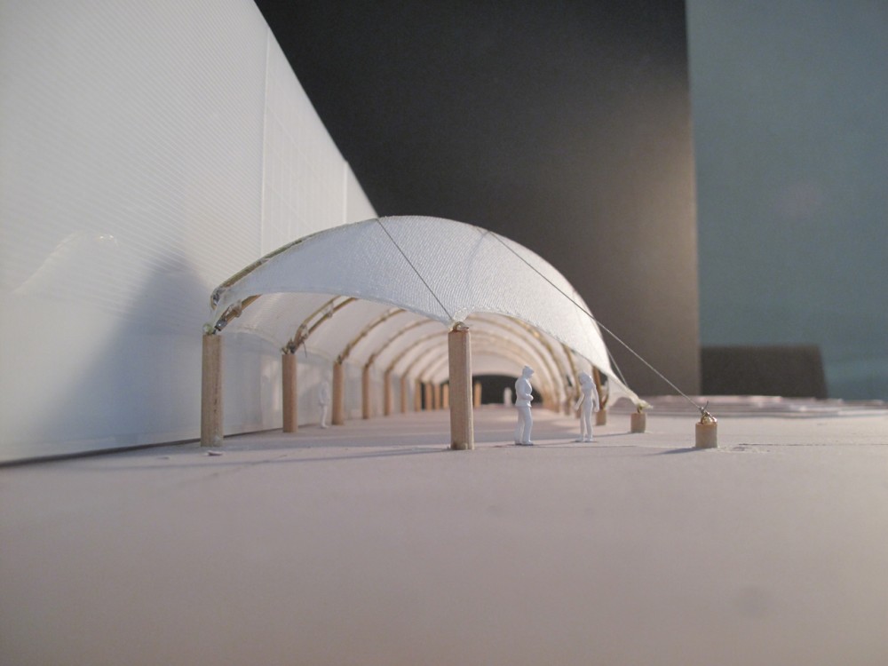 The Porte Cochere may be relocated to another location on the UN campus or to any other site of the UN’s choosing. With this as a starting point, the design developed to have minimal anchorage points and to be modular in nature, using prefabricated steel trusses allowing for quick installation which minimizes the impact of construction crews on site. The high-tech textile membrane’s function is two fold; it provides support as a working tensile element equally distributing structural loads and defuses sunlight to naturally illuminate the space below. The structure uses two fabrics, a Teflon coated glass fabric as the main fabric and a silicone coated glass fabric for greater translucency in the arches. Functionally the canopy provides shelter for the motorcades as they load and unload delegates, requiring ventilation for the idling cars inside. The open facades and linear vents that run the entire length of the trusses allow fresh air to flow freely throughout the enclosure.