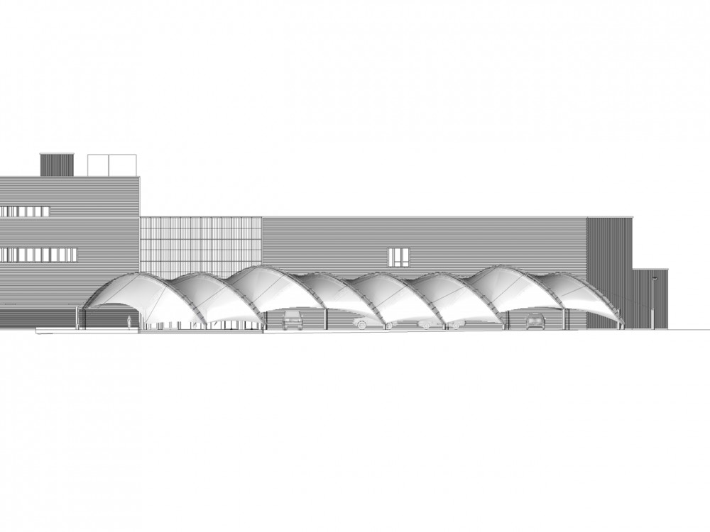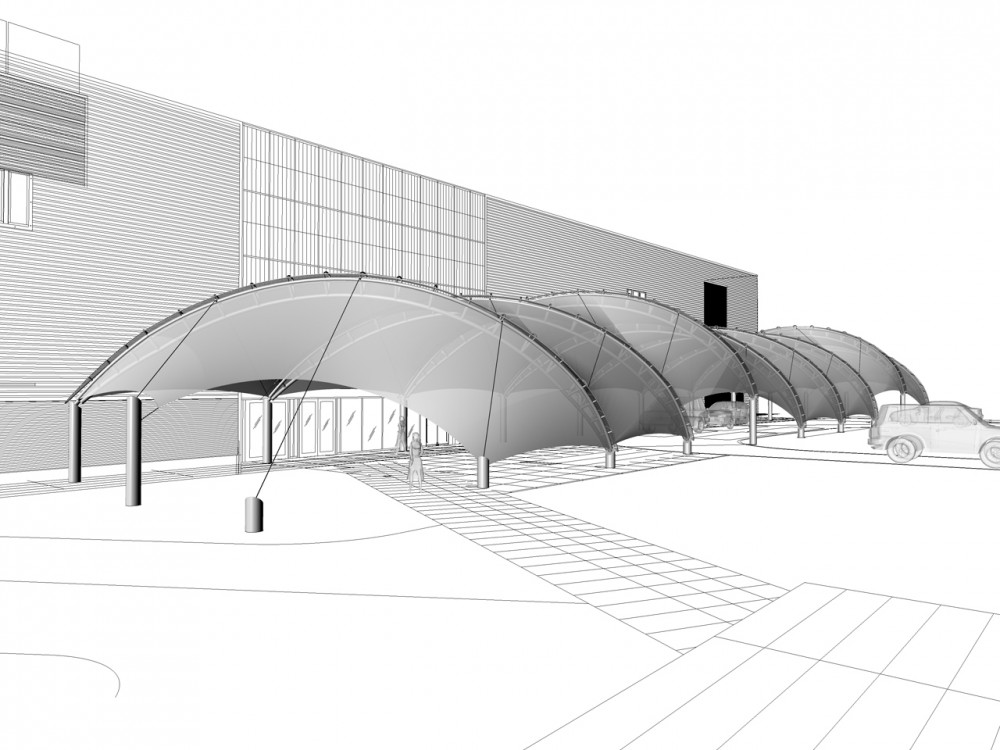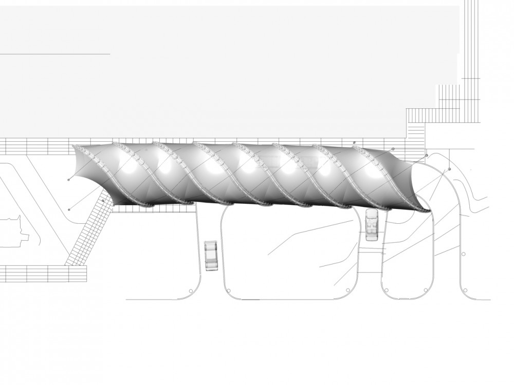 The design explores lightness as a visual, physical and sustainable approach, using a minimum of materials to reduce its environmental impact. FTL seeks to build responsive structures that contain spaces which inspire, where building, nature and people can meet. Drawing its inspiration from the surrounding landscape the canopy is nested within the campus landscape utilizing the contours of site as a visual buffer. Helical arches undulate and twist along the length of the roadway gently peeling away from the main building.