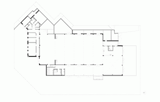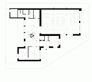 The renovation of the original cultural facility involved shifting the existing entrance and adding a new foyer with a slanted roof.