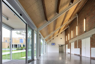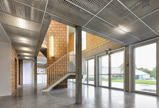 A glazed frontage enhances the connection between the public square outside and the multipurpose hall. The foyer also now extends into a cafeteria space that opens onto a new terrace.