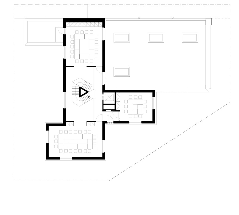 Offices and a new foyer are accommodated in the remaining ground floor rooms. A concrete staircase that spirals around a pillar near the entrance provides access to the conference rooms on the upper floor.