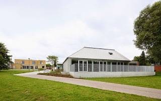 Grey cement fibre panels added to the building’s exterior give it a scaly uniform appearance. This insulated skin combines with the new glazing and anodised aluminium frames to improve the facility’s energy efficiency.