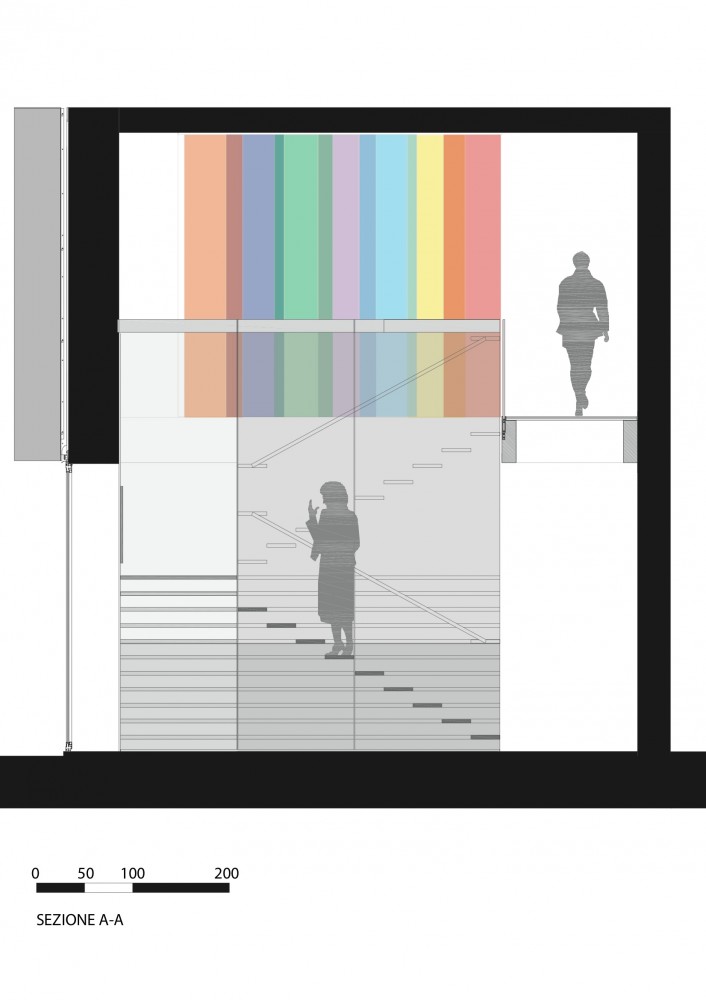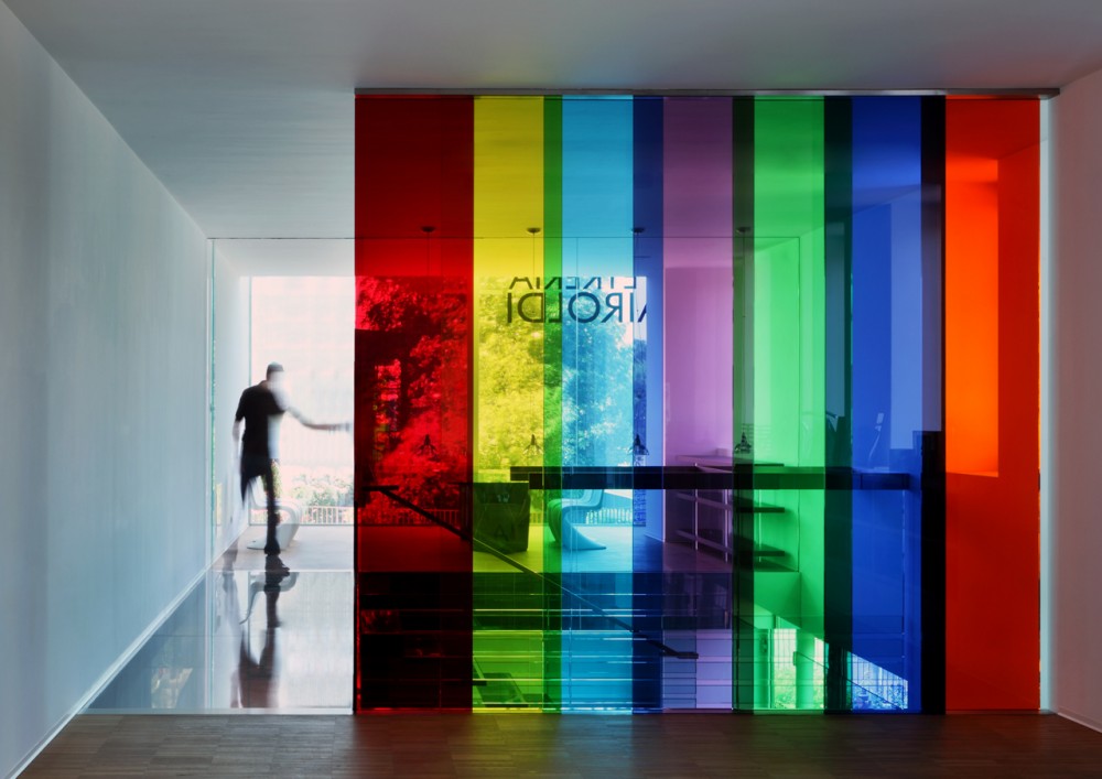 Research on colour that glass exalts with transparency, reflections and opacity in the dividing screen on he first floor is very interesting: it’s a glass high-to-floor panels composition of seven different colours, staggered and partially overlapped that creates several particular intermediate colours.