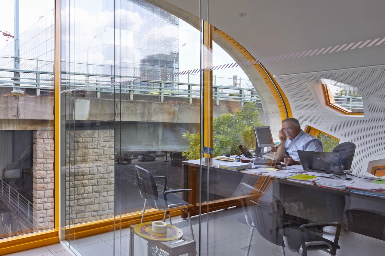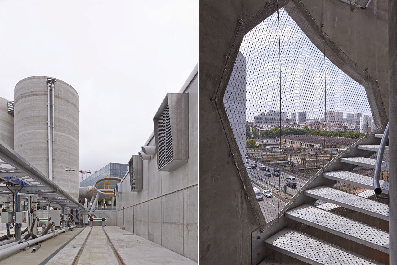 Vib architecture completed five silos – all made of concrete, rising from the ground surfaced with concrete too – for a cement distribution center, including a quality control building and space for offices, in one of Paris’s muting urban areas.