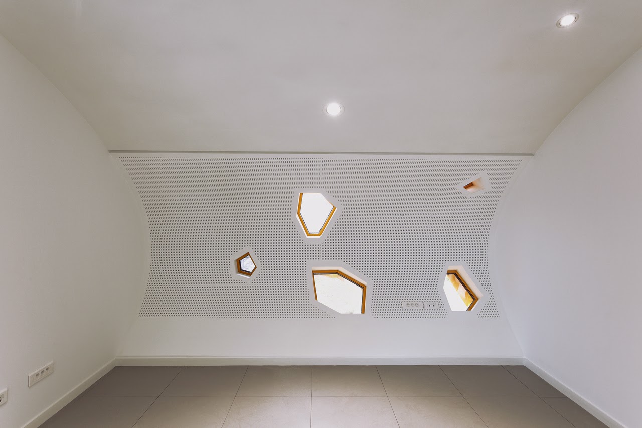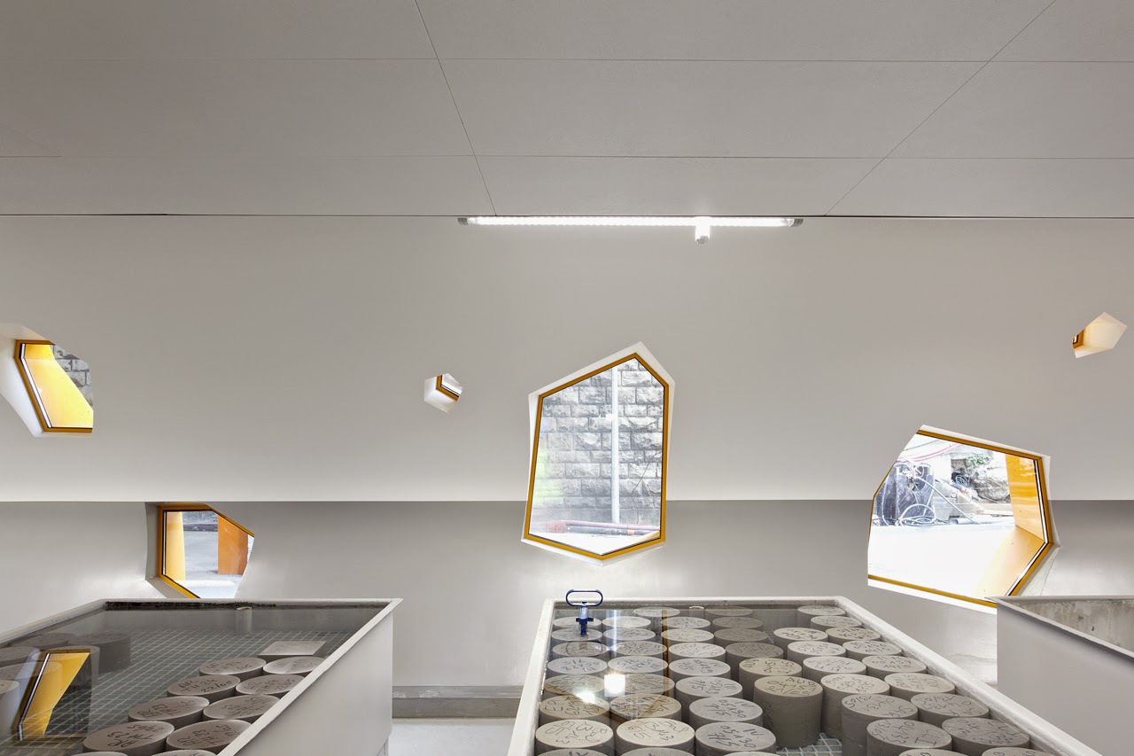 For the office and quality control center, the light at either end of the ‘silos’ was not enough for all work spaces. The opening on the shells had to be big enough to bring in light but small enough to keep the mass and the surface. The polygonal shape chosen for these openings was imagined as a form of abstraction of two different ideas: the shape of the stones that are used in making the concrete as one, or a mineral fragment or a broken rock as another.