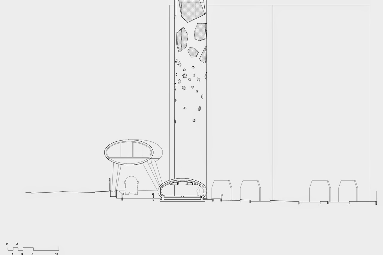 The vertical lift/stair tower is the most visible piece of the building, that acts as a signal by rising only 5 meters from the ring road. The design for the openings is similar but they were fitted with a simple inox mesh. The architects wanted the openings to widen up and lighten up as the tower rises, in contrast to the main silos in the background.