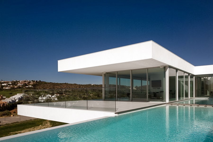 En un lenguaje arquitectónico, puro y contemporáneo, creamos terrazas cubiertas y patios para la vida al aire libre. Estos se cortan a partir del volumen horizontal que es de color blanco y altamente transparente. Este volumen se sienta suavemente sobre un soporte de hormigón a la vista dando la apariencia de la casa flotante sobre el paisaje. El contacto en el medio ambiente, lo que queremos preservar, se reduce al mínimo y se resuelve el difícil equilibrio del edificio con su soporte físico. Esto asegura una ligereza visual deseable.