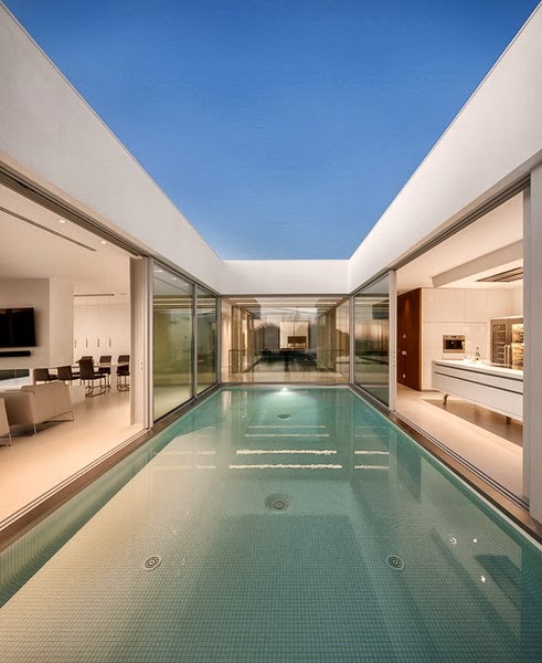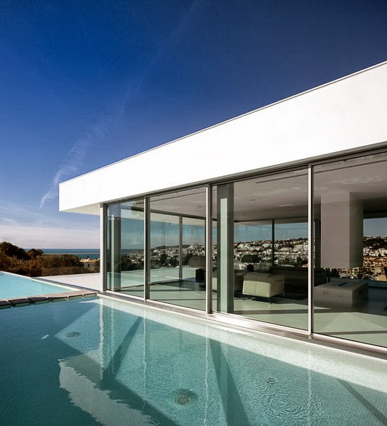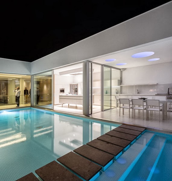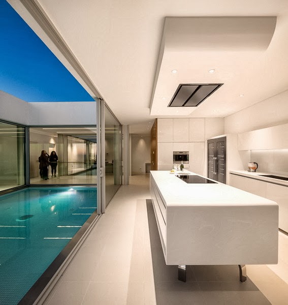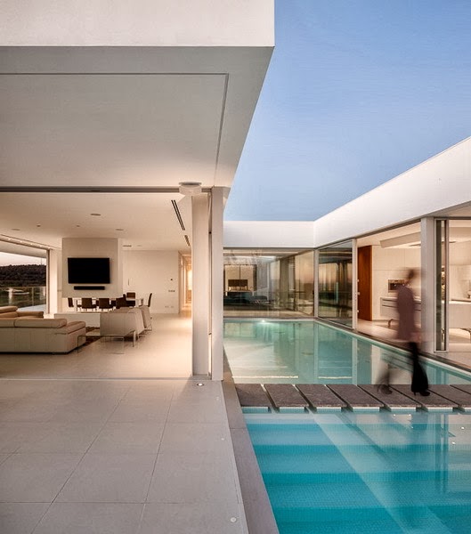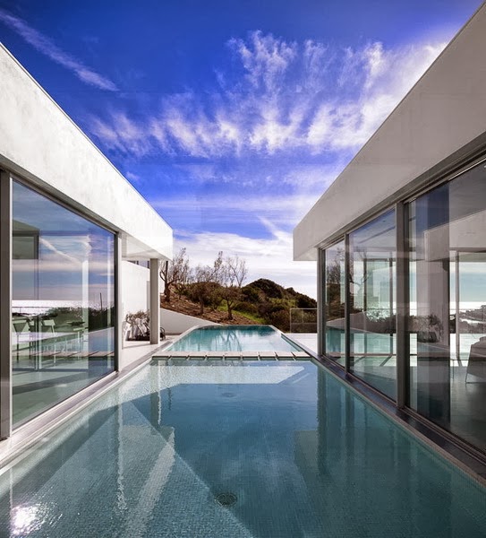 La casa se funde con una larga superficie de agua, que disecciona el espacio de la cocina y el amplio salón. Estos espacios se complementan con terrazas protegidas del viento, pero abierta al sol y a unas vistas impresionantes. Esta es la zona social de la casa, abierta y fluida.