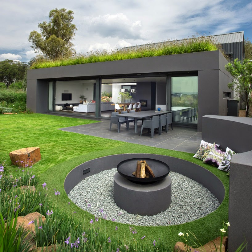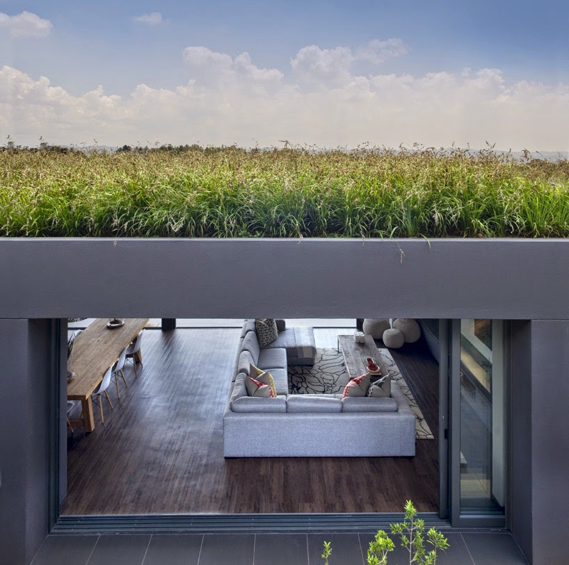 the materiality of the residence is characterized by an exterior façade clad in steel and concrete. the metal alloy encloses a gabled roof structure that uses its durability to reduce the overall height of the house with the understanding that a conventional roof of wooden joists and struts would have added an unnecessary amount of volume. this has helped the architects aesthetically blur the house into the treetops when viewed from afar. furthering this link, the cement mixture provides a surface occupied by a green roof where fresh grass extends the ground floor garden to the rooms above.