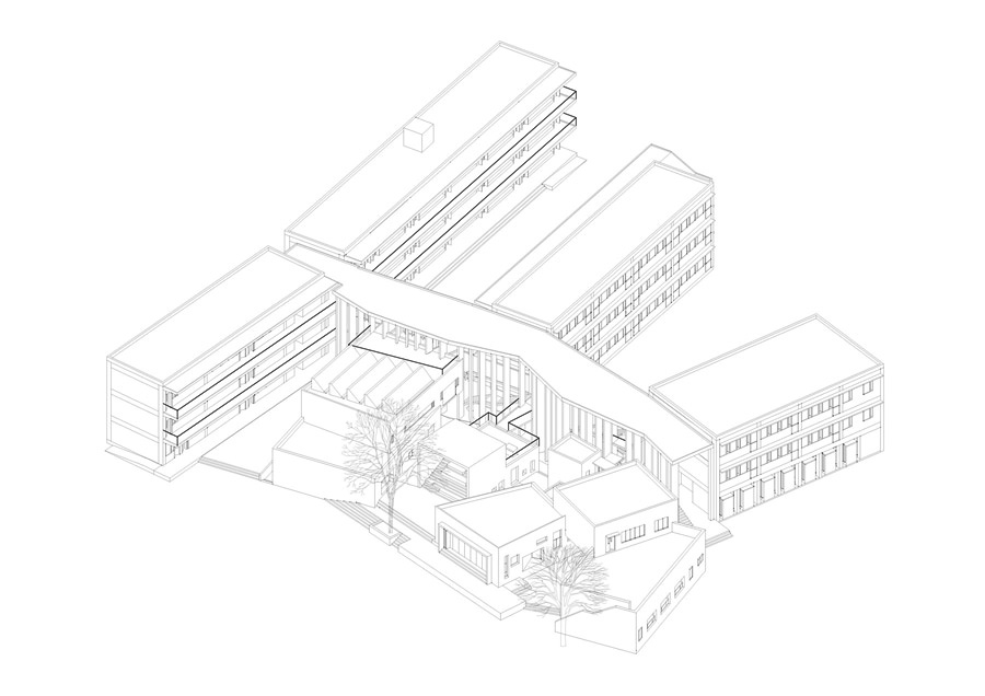 The design is conceived as a cluster of small buildings to create a micro-city like campus. The fragmentary instead of unified building composition creates many urban like place such us streets, plazas, courtyards, and steps at various scales. These places are intended to encourage diversified and spontaneous activities of children. Small-scale playful corners and labyrinth like space as passage and playground are created to provoke children’s curiosity and imagination. Through this, we also intend to continue the urban space memory of Xiaoquan town in the school building, so as to avoid completely losing the continuity of urban fabric during rebuilding process after earthquake.