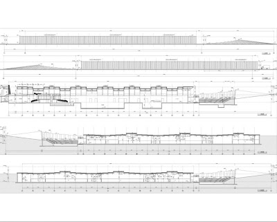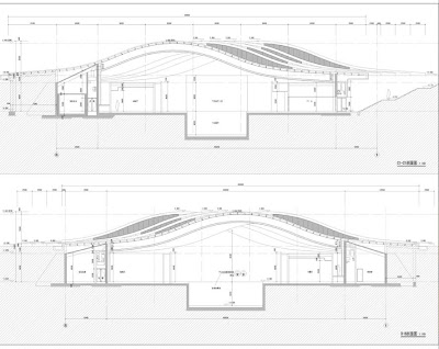 The entire appearance is designed to present the arrangement of several arching-shaped strips in 4 meters wide by 40 meters long each. The exhibition hall is a one layer long-span space, which is 6 meters deep underground while the highest elevation above ground is 5.8 meters. The performing arts center based on the careful recovery of histrionic place in south edge has an underground layer which is as high as 3.6 meters, the height of cornice on ground floor is 7.0 meters. On the front facade,the architect took the design of hollow-out,which is benefit for side and makes the whole building more slim and graceful.