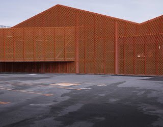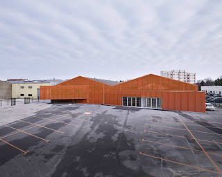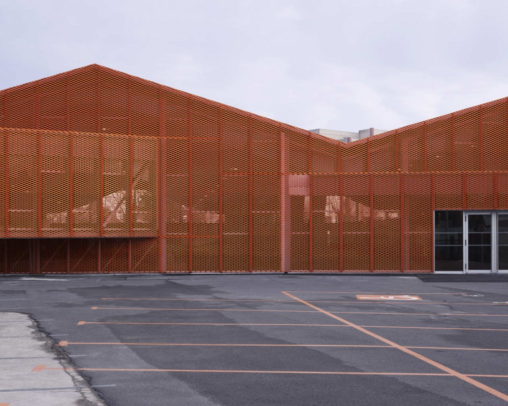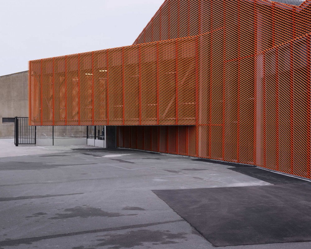 The metal mesh allows spectators to watch activities inside and is gradually perforated from top to bottom. The mesh acts like a shutter, controling direct sunlight and the color is stricking; it is deliberately conspicuous. This colorful mesh protects the equipment as the expanded metal is very resistant and anti-graffiti. It is doubled with a curtain wall to protect users from prevailing winds and reduce any noise nuisance to nearby houses. Outside the building the front square is treated using an orange frame to draw parking spaces, which overlap the textures of the existing floor coatings.