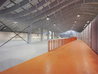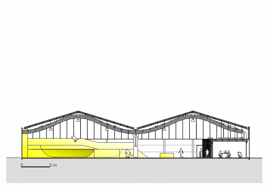 Linking the two programs Inside the hall the various program elements are organised longitudinally, to optimise the length of the skate tracks and provide an entrance to the youth centre along the southern facade. When entering the building, there are a series of enclosed and heated rooms installed on the right identified by emerging prism. This set is built with a light frame and placed on the existing slab, with entrances distributed along an indoor walkway. This walkway is fully integrated into the space used for the skate park, separated using a handrail that runs its entire length. It enables “spectators” to watch the skaters safely. The long wall is covered with an acoustic fabric stretched to form large “dimples”.