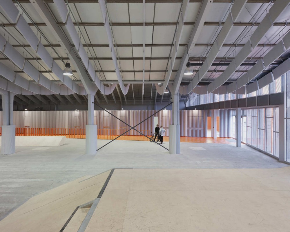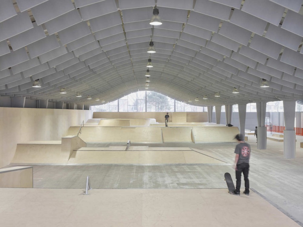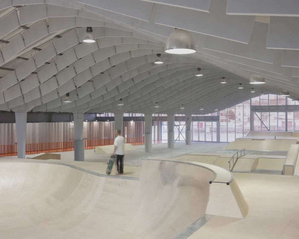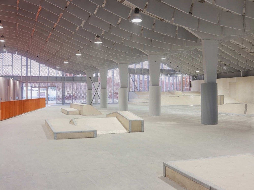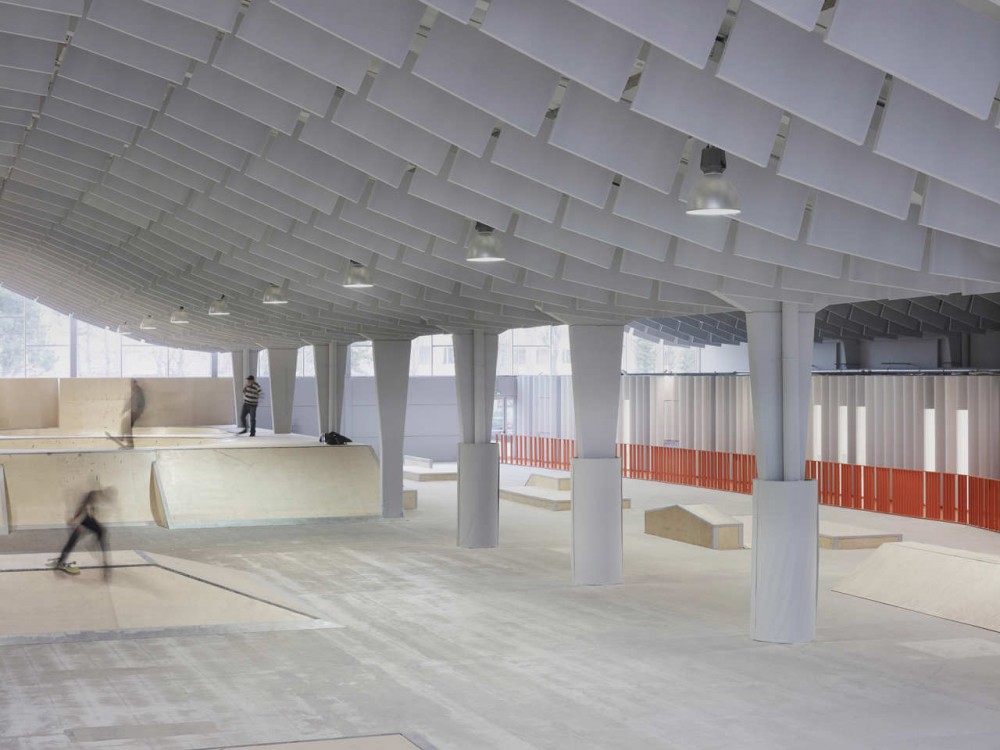 This absorbing surface is designed to reduce reverberated sounds caused by skateboarding on hard surfaces. The wall is also provided with vertical windows offering views for both users of the skate park and youth centre. A sinusoid layer of large acoustic baffles is suspended from the ceiling to increase acoustic comfort for users. These technical elements offer inexpensive modifications that morph the inner space and hide the unsightly ceiling.