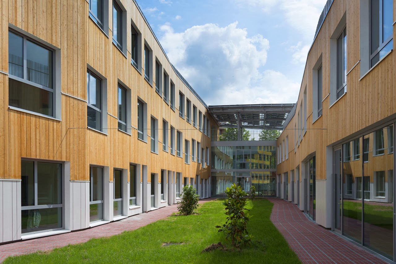 The building’s siting facilitated south-facing orientation of all the classrooms and playgrounds in order to make the greatest possible use of passive solar energy. This spatial disposition also made it possible to increase the surface areas on the south required for the photovoltaic panels which were integrated into the architecture of the covered playground areas.